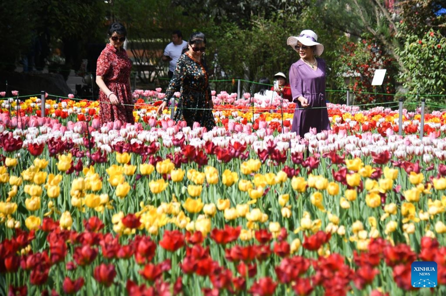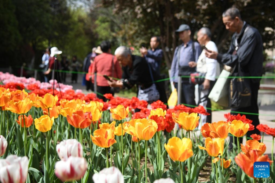 | Orang ramai menikmati bunga tulip di Taman Botani Xi’an di Provinsi Shaanxi, barat laut China pada 10 April 2025. (Xinhua/Zhang Bowen) |