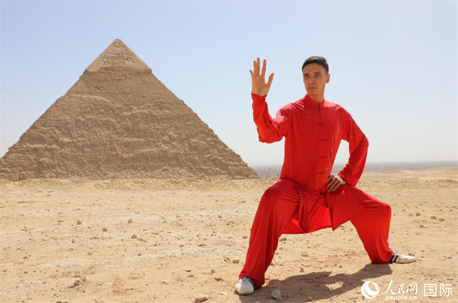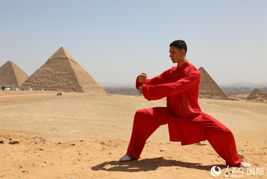 | Seorang warga Mesir sedang mempraktikkan Tai Chi di kaki Piramid Giza di Mesir. (People’s Daily Online/Hind Fathi Muhammad) |