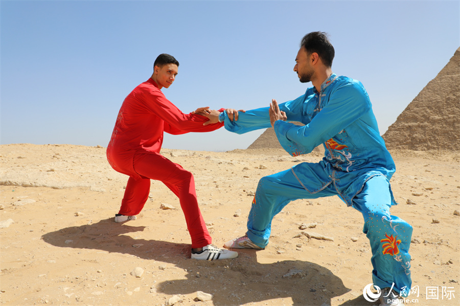 | Dua orang warga Mesir sedang mempraktikkan Tai Chi di kaki Piramid Giza di Mesir. (People’s Daily Online/Hind Fathi Muhammad) |