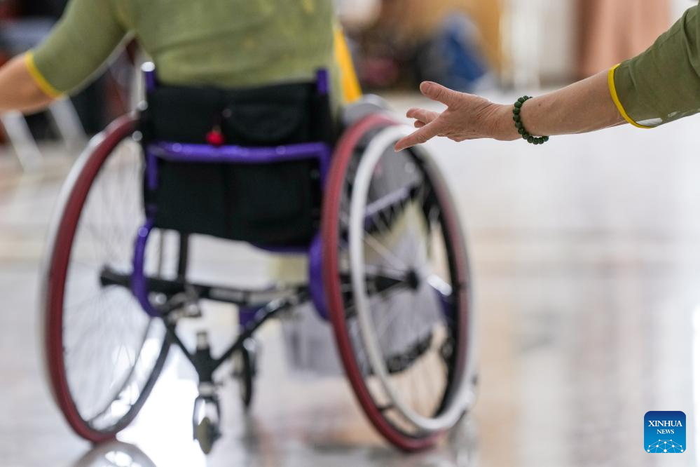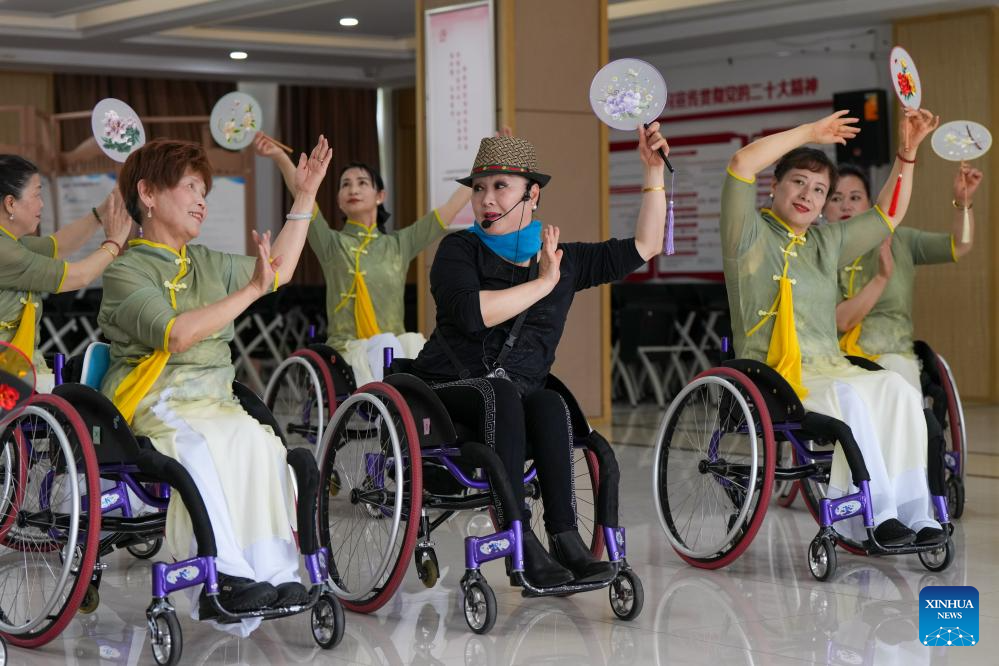 | Song Aixia (di hadapan) dan rakan-rakannya membuat tarian raptai berkerusi roda di pusat khidmat komuniti di Nanjing, Provinsi Jiangsu di timur China pada 27 April 2025. (Xinhua/Li Bo) |