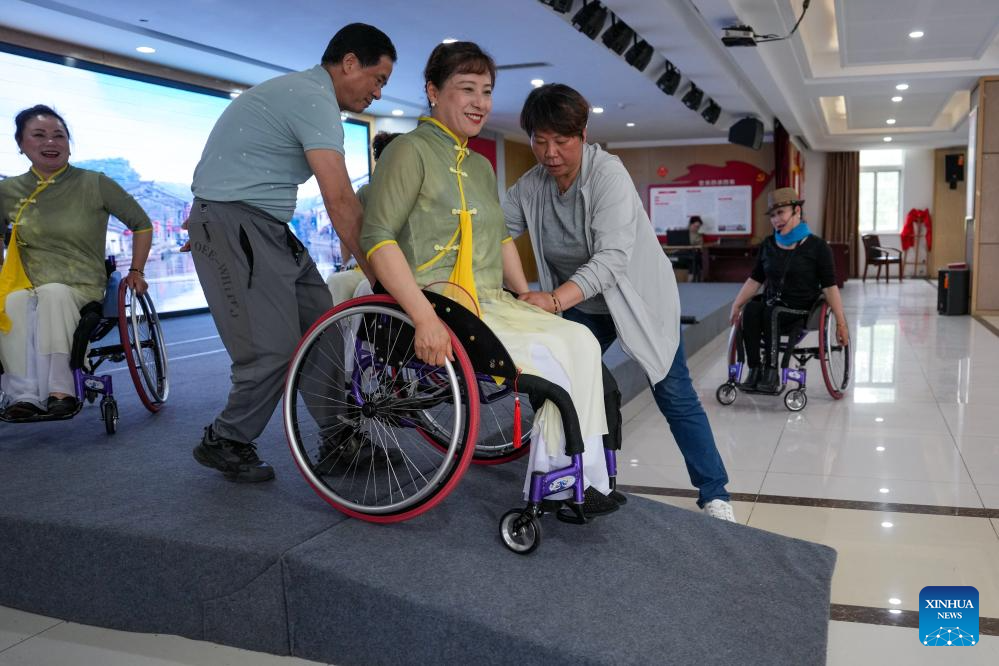 | Song Aixia (dua dari kanan, barisan pertama di pentas) dan rakan-rakannya membuat raptai persembahan tarian berkerusi roda di pusat khidmat komuniti di Nanjing, Provinsi Jiangsu di timur China pada 27 April 2025. (Xinhua/Li Bo) |