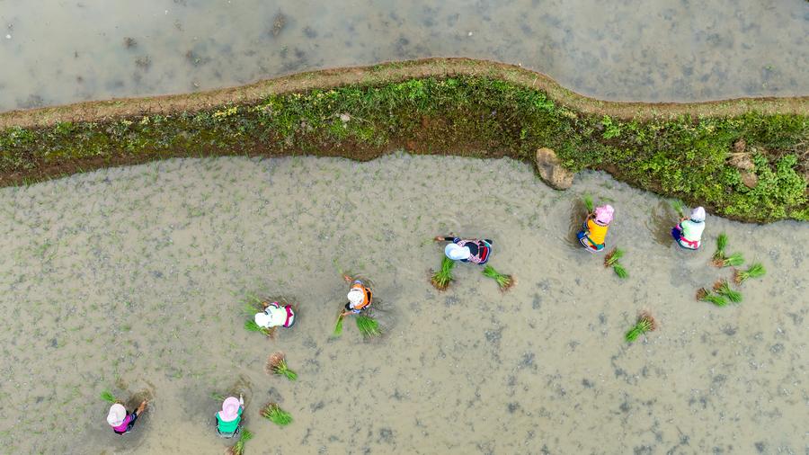 | Foto sudut udara bertarikh 2 Mei 2025 ini memaparkan penduduk kampung sedang memindah tanam pembenihan padi di sawah padi berteres di Kampung Jiayin, Kaunti Honghe, Kawasan Autonomi Yi dan Hani Honghe di Provinsi Yunnan, barat daya China. (Xinhua/Hu Chao) |