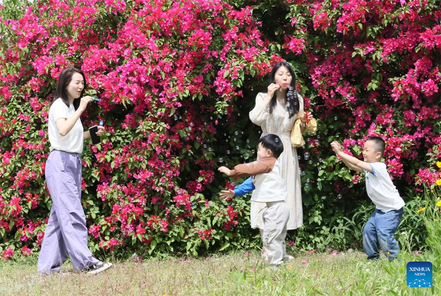 | Ibu bapa bermain dengan anak di bandar Leshan, provinsi Sichuan, barat daya China, 10 Mei 2025. (Xinhua/Li Huashi) |