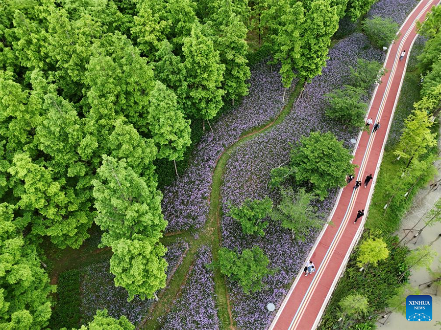 | Foto dron ini menunjukkan penduduk tempatan bersantai-santai di sebuah taman di Yueqing, provinsi Zhejiang, timur China, 11 Mei 2025. (Xinhua/Cai Kuanyuan) |