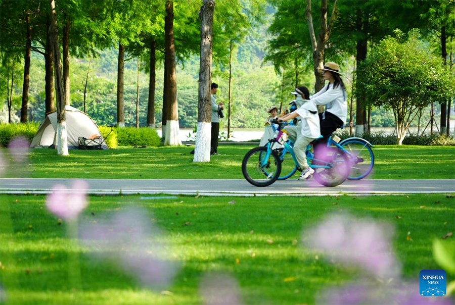 | Penduduk tempatan menunggang basikal di sebuah taman di Yueqing, provinsi Zhejiang, timur China, 10 Mei 2025. (Xinhua/Cai Kuanyuan) |