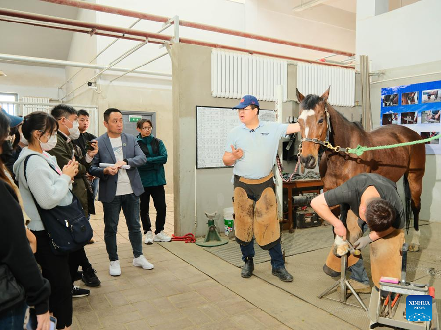 | Pelajar dari Universiti Malaysia Sarawak (UNIMAS) belajar memasang kasut kuda di Kolej Vokasional dan Teknikal Universiti Pertanian Mongolia Dalam di Baotou, utara China, 9 Mei 2025. (Xinhua/Ma Jinrui) |