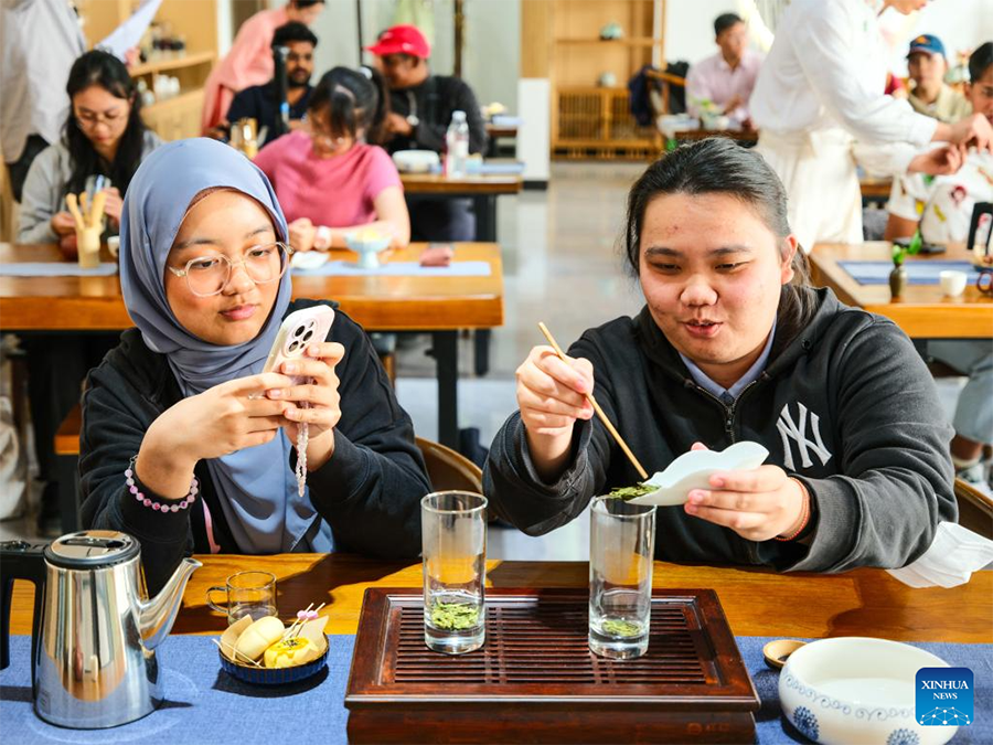 | Pelajar dari Universiti Malaysia Sarawak (UNIMAS) belajar membuat teh di Kolej Vokasional dan Teknikal Universiti Pertanian Mongolia Dalam di Baotou, utara China, 9 Mei 2025. (Xinhua/Ma Jinrui) |
