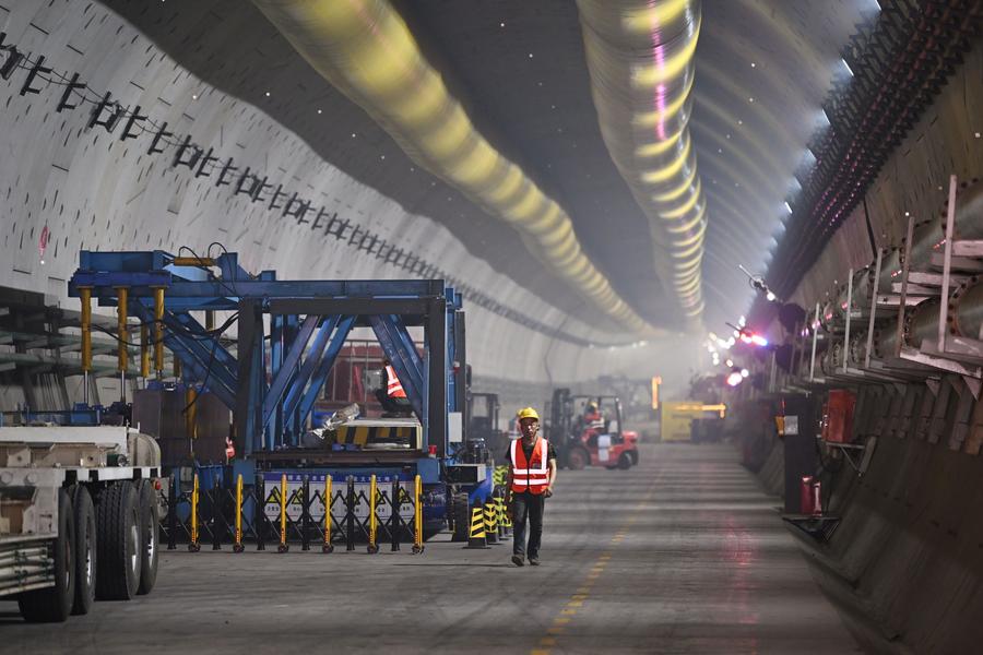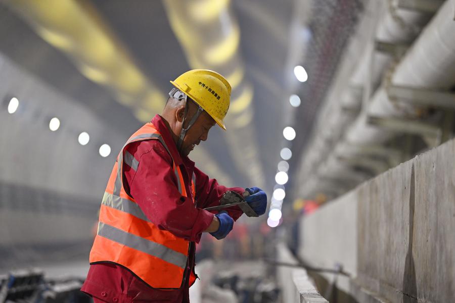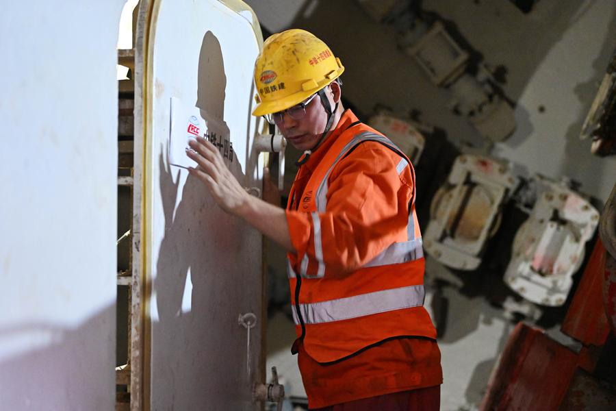 | Seorang pekerja bekerja di tapak pembinaan projek Terowong Jingu Haihe Rel Kelajuan Tinggi Tianjin-Weifang di Tianjin, utara China, 19 Mei 2025. (Xinhua/Li Ran) |