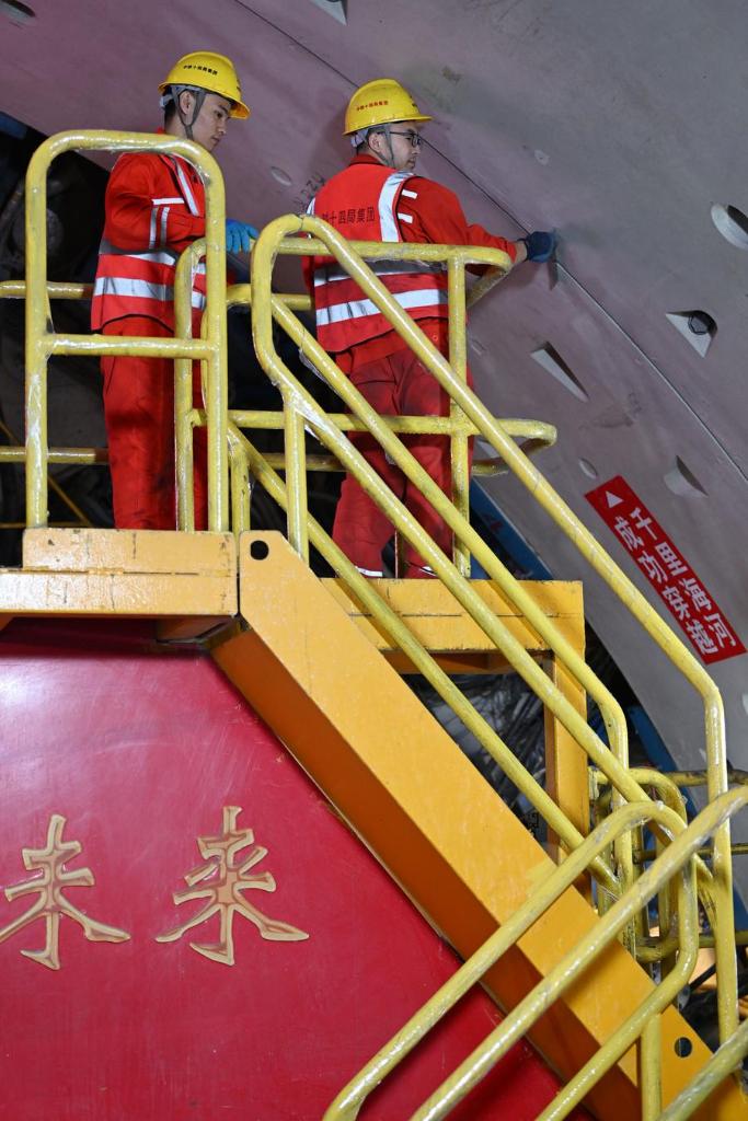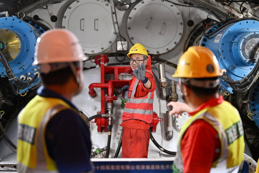 | Pekerja bekerja di tapak pembinaan projek Terowong Jingu Haihe Rel Kelajuan Tinggi Tianjin-Weifang di Tianjin, utara China, 19 Mei 2025. (Xinhua/Li Ran) |