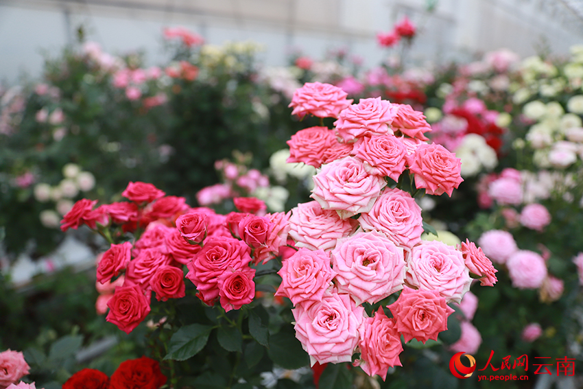| Juruteknik memeriksa pertumbuhan jenis baru mawar China di pusat inovasi teknologi bunga antarabangsa di Dounan, Kunming, ibu provinsi Yunnan, selatan China. (People’s Daily Online/Li Faxing) |