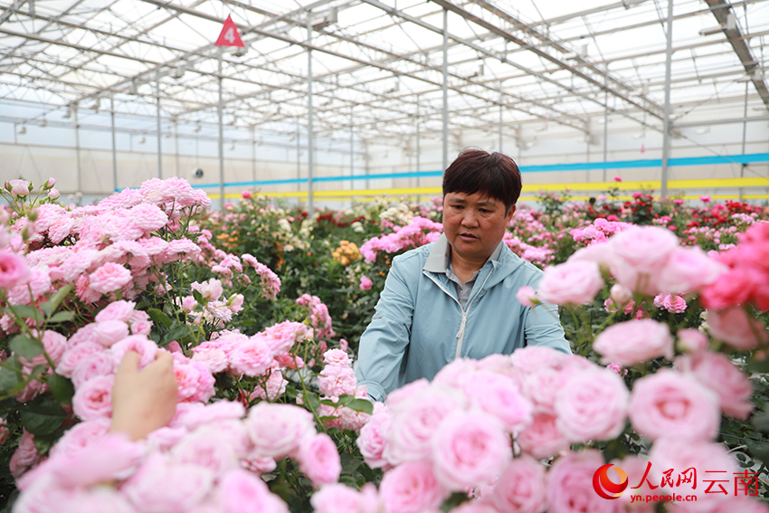 | Seorang juruteknik memeriksa pertumbuhan jenis baru mawar China di pusat inovasi teknologi bunga antarabangsa di Dounan, Kunming, ibu provinsi Yunnan, selatan China. (People’s Daily Online/Li Faxing) |
