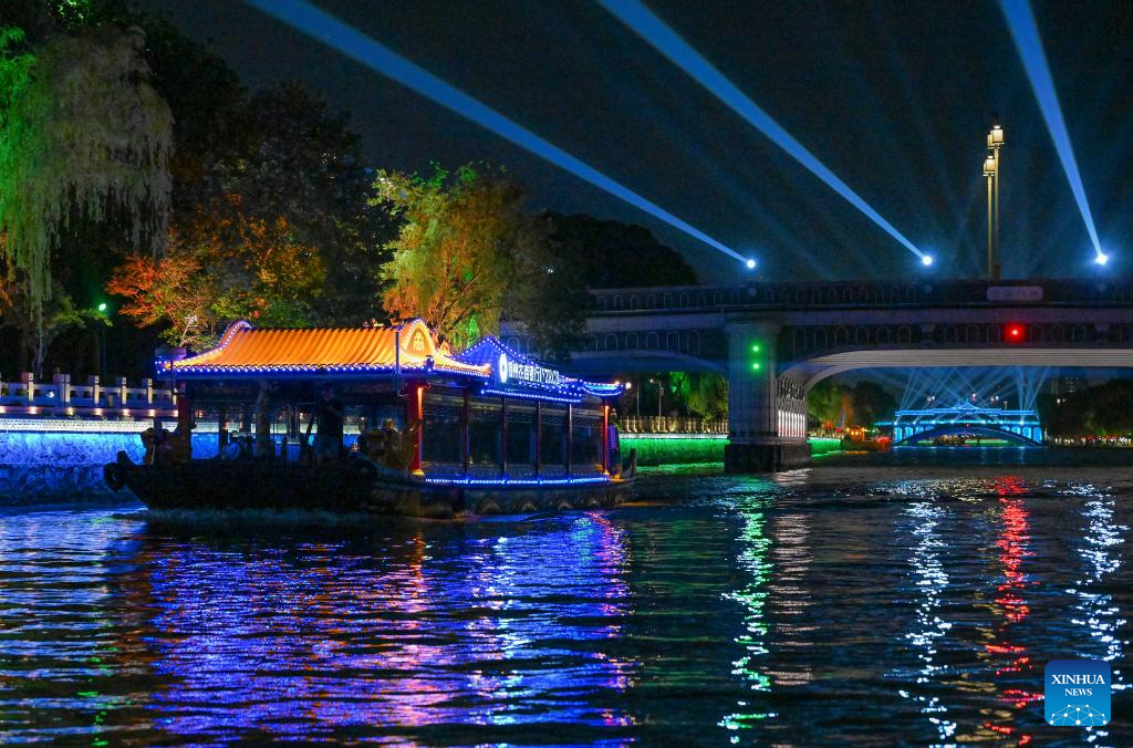 | Pertunjukan lampu dipersembahkan di Terusan Besar, di Yangzhou, Provinsi Jiangsu, timur China pada 19 Mei 2025. (Xinhua/Chen Shuo) |