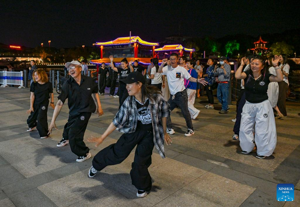 | Orang ramai menari di tebing Terusan Besar di Yangzhou, Provinsi Jiangsu, timur China pada 19 Mei 2025. (Xinhua/Chen Shuo) |