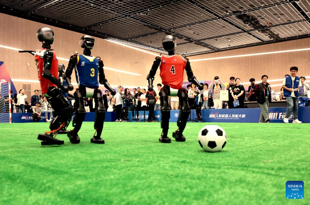 | Robot ‘bermain’ bola sepak semasa Pertandingan Kemahiran Robot Humanoid Antarabangsa 2025 di Balai Sains Zhangjiang di Shanghai, timur China pada 29 Mei 2025. Pertandingan Kemahiran Robot Humanoid Antarabangsa 2025 dilancarkan di Shanghai pada Khamis, dengan memfokuskan terhadap perindustrian, senario komersial dan isi rumah. Lebih daripada 60 pasukan global telah bersaing dalam inovasi teknologi teras dan pengaplikasian robot. (Xinhua/Fang Zhe) |