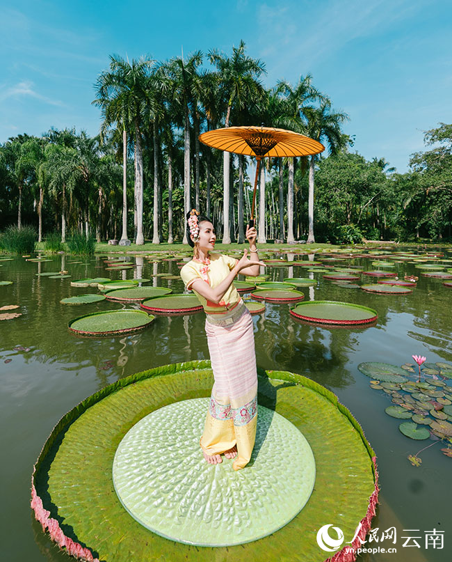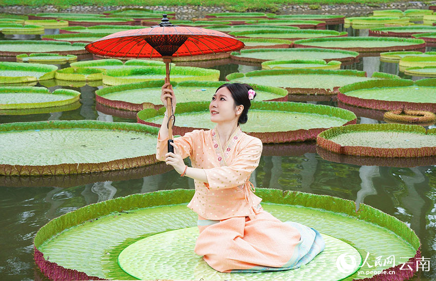 | Seorang wanita beretnik Dai sedang bersimpuh di atas daun bunga teratai bersaiz besar. (People’s Daily Online/Zhang Jiaojiao) |