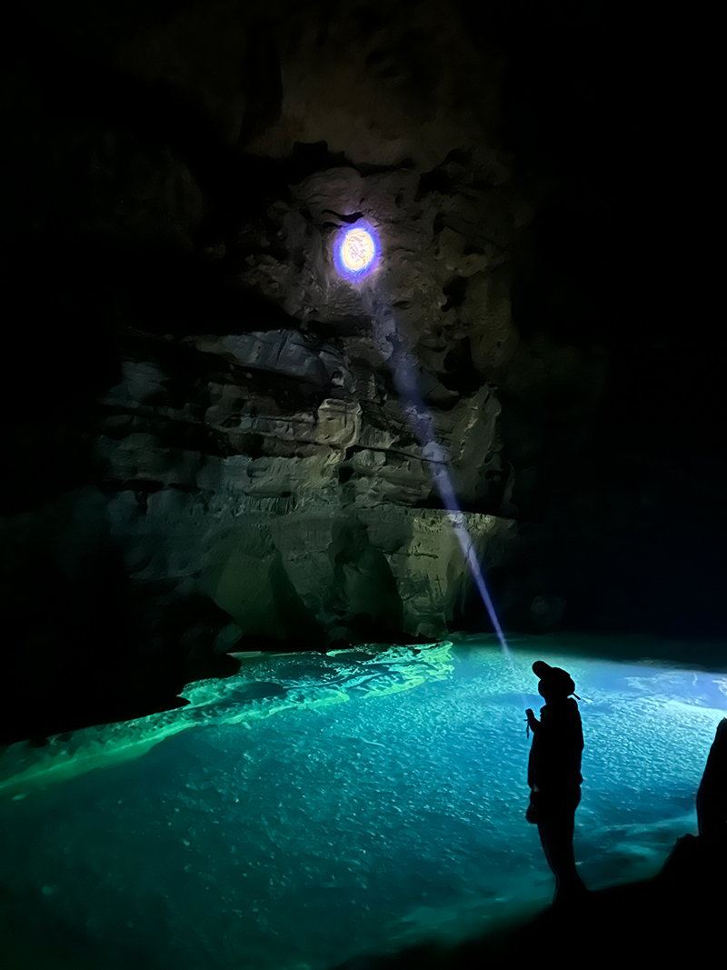Telusuri dasar gua yang sunyi sepi, melalui pelbagai bentuk stalaktit yang menghiasi koridor gua, mengikut bunyi air membobok, sampailah beransur-ansur kelihatan rupa lembangan sungai bawah tanah yang bersambung dengan Sungai Li.