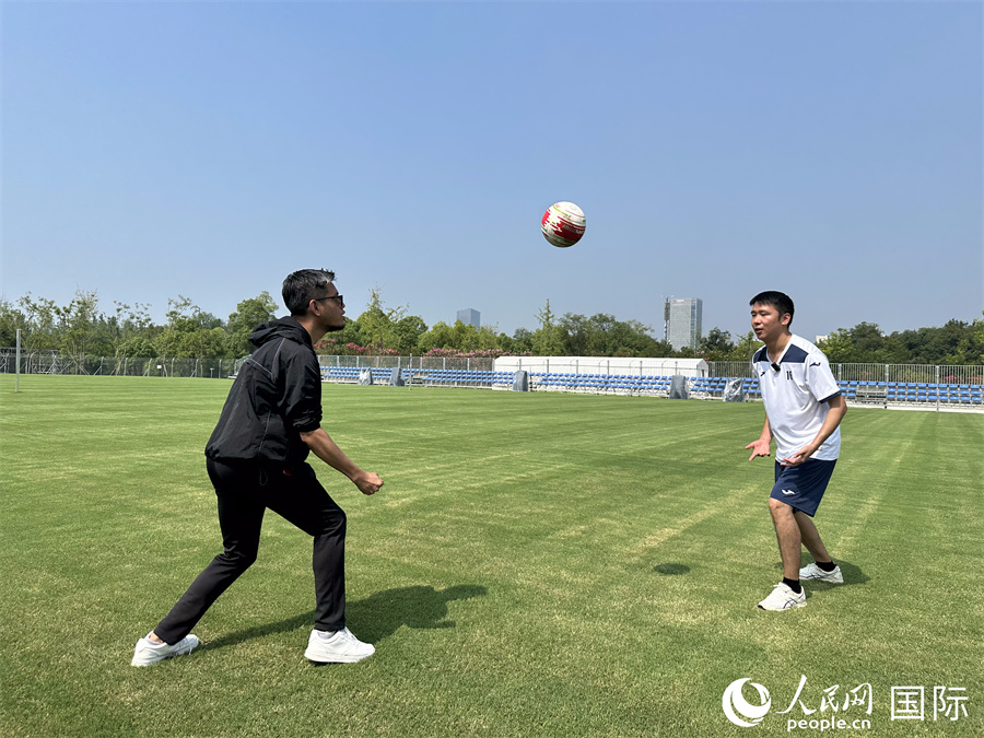 | Syukri (kiri), pakar asing People’s Daily Online, berlatih bermain faustball. (Sun Shuyu/People’s Daily Online) |