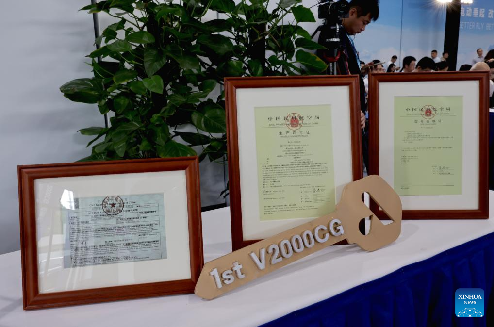 | Sijil kelayakan terbang (kiri), sijil pengeluaran (tengah) dan sijil jenis V2000CG CarryAll dipamerkan semasa upacara penyerahan pesawat itu di Kunshan, Provinsi Jiangsu di timur China pada 22 Julai 2025. (Xinhua/Fang Zhe) |