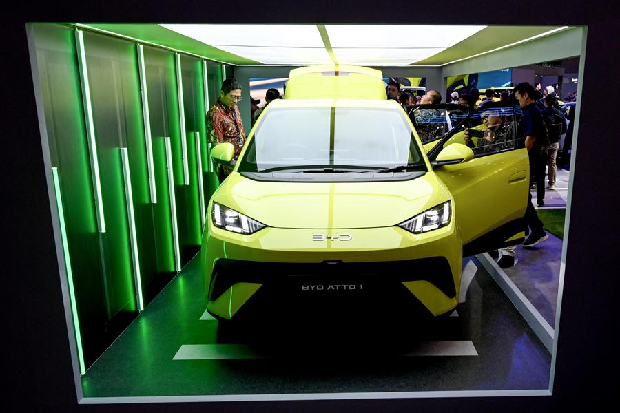 | Orang ramai melawat reruai pembuat kenderaan China, BYD semasa hari media eksklusif Pameran Auto Antarabangsa Indonesia GAIKINDO (GIIAS) 2025 di Pameran Konvensyen Indonesia di Tangerang, Banten, Indonesia pada 23 Julai 2025. (Xinhua/Agung Kuncahaya B.) |
