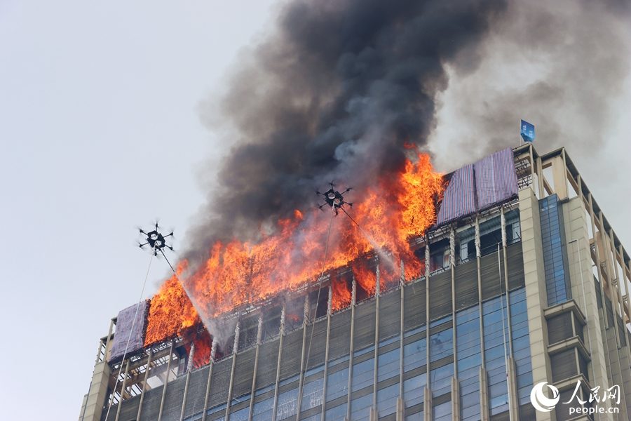 | Dron mengambil bahagian dalam latihan kebakaran di bangunan setinggi 130 meter di Zon Pembangunan Industri Teknologi Tinggi Fuzhou di Provinsi Fujian, tenggara China. (People’s Daily Online/Xie Xingyu) |