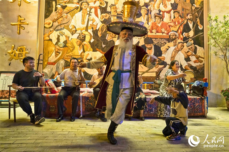 | Pewaris warisan budaya tidak ketara tempatan mempersembahkan tarian tradisional di Kota Kuqa Purba. (People’s Daily Online/Tang Song) |