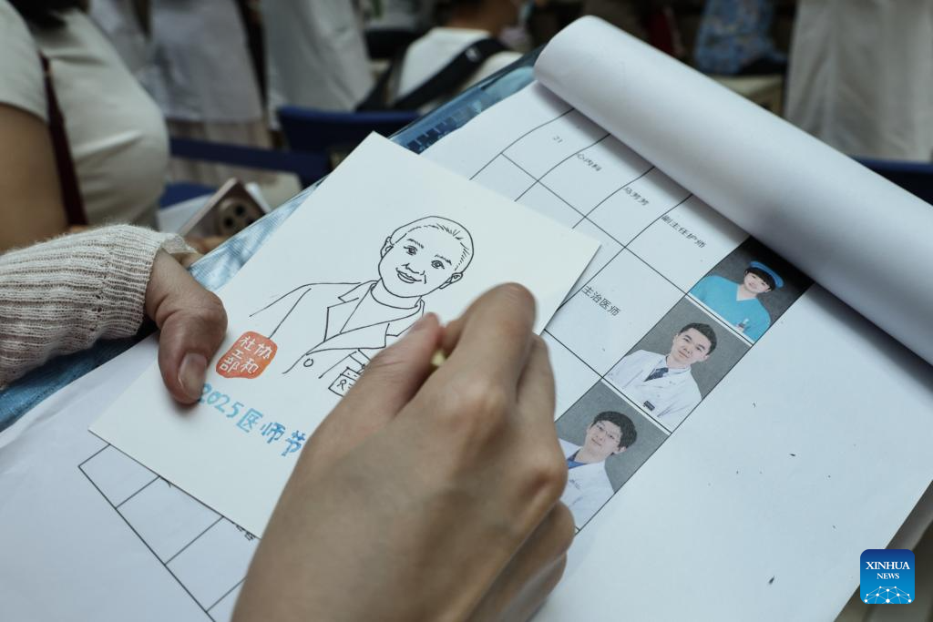 | Seorang sukarelawan melukis gambar kartun yang diperibadikan buat seorang doktor semasa berlangsungnya acara klinik percuma di Peking Union Medical College Hospital (kampus Dongdan) di Beijing, ibu negara China pada 19 Ogos 2025. (Xinhua/Zhang Yuwei) |