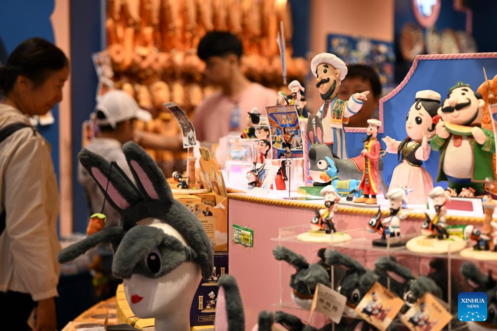 | Pelancong sedang memilih produk kreatif dan kebudayaan di Grand Bazaar, Urumqi, Wilayah Autonomi Uygur Xinjiang di barat laut China pada 21 Ogos 2025. (Xinhua/Wang Fei) |