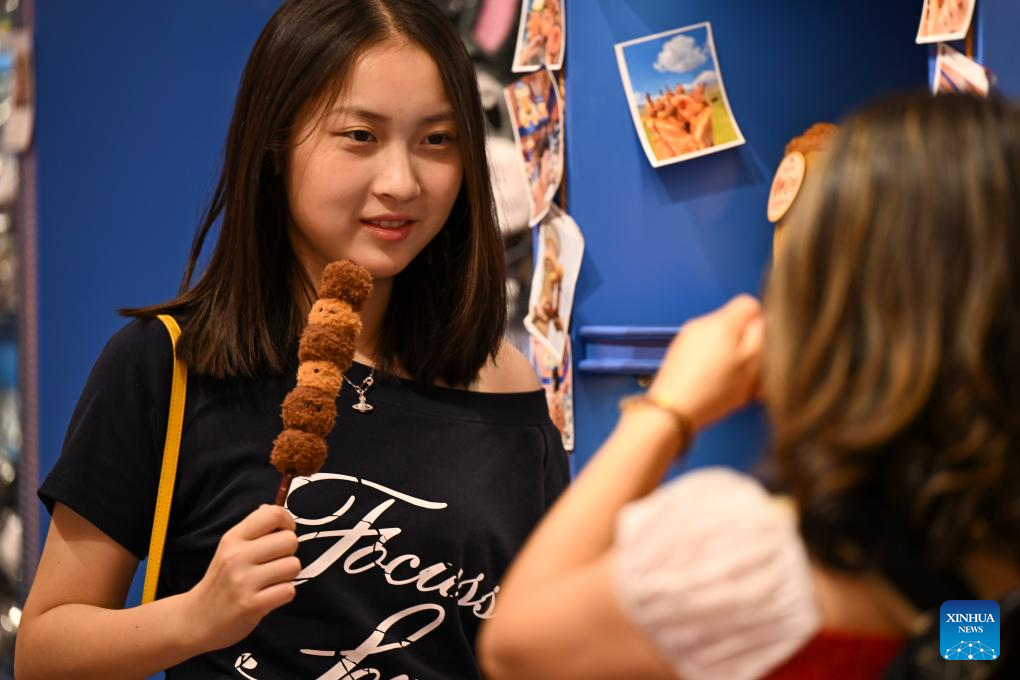 | Seorang wanita mengambil foto sambil memegang satu produk kreatif dan kebudayaan di Grand Bazaar, Urumqi, Wilayah Autonomi Uygur Xinjiang di barat laut China pada 21 Ogos 2025. (Xinhua/Wang Fei) |