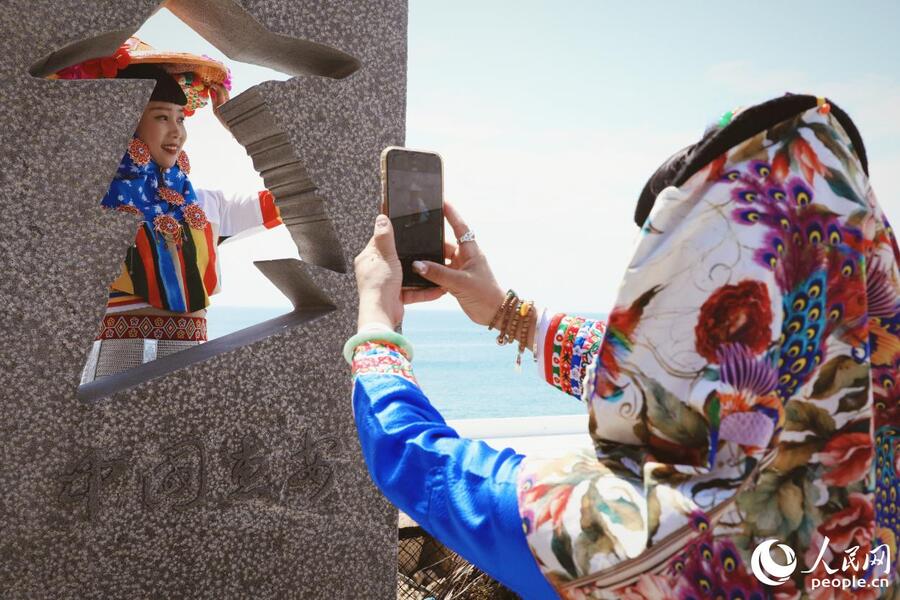 | pelancong memakai pakai tradisional wanita Hui’an dan mengambil foto di sebuah taman kebudayaan di kaunti Hui’an, Provinsi Fujian, tenggara China. (People’s Daily Online/Li Weiyi) |