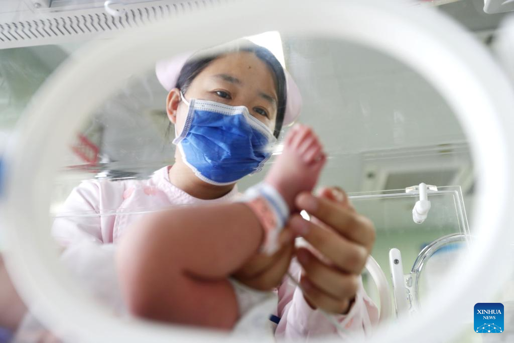 | Seorang jururawat sedang mengendalikan seorang bayi di sebuah hospital di Lianyungang, Provinsi Jiangsu di timur China pada 6 Oktober 2025. (Xinhua/Wang Chun) |