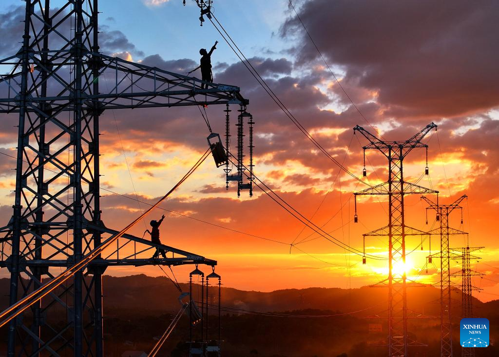| Foto bertarikh 6 Oktober 2025 ini menunjukkan pekerja sedang memasang kabel di sebuah menara tinggi di Hengyang, Provinsi Hunan. (Xinhua/Cao Zhengping) |