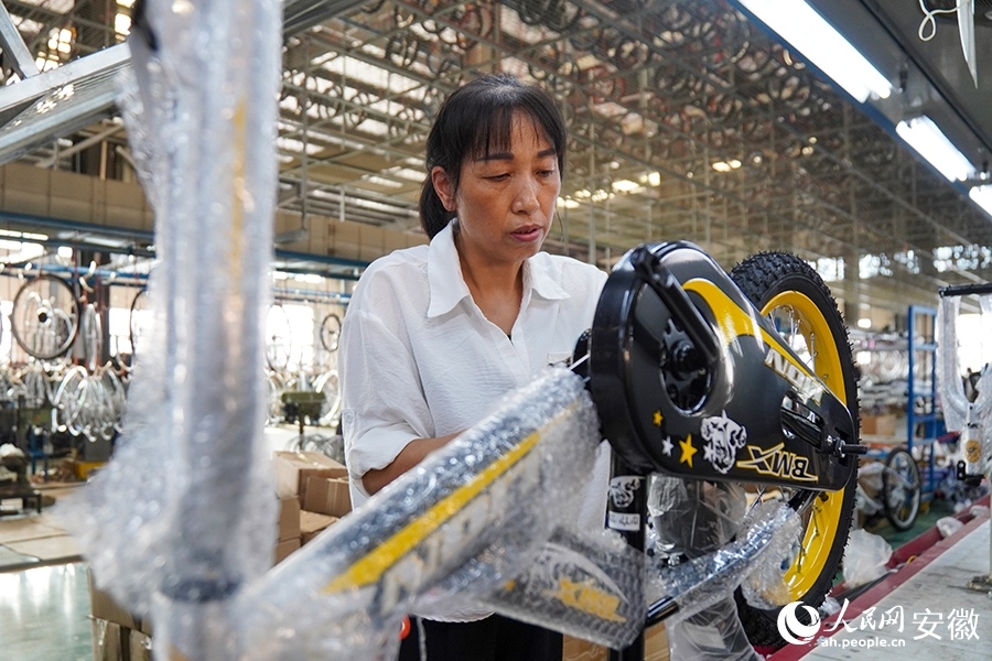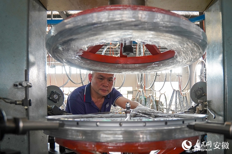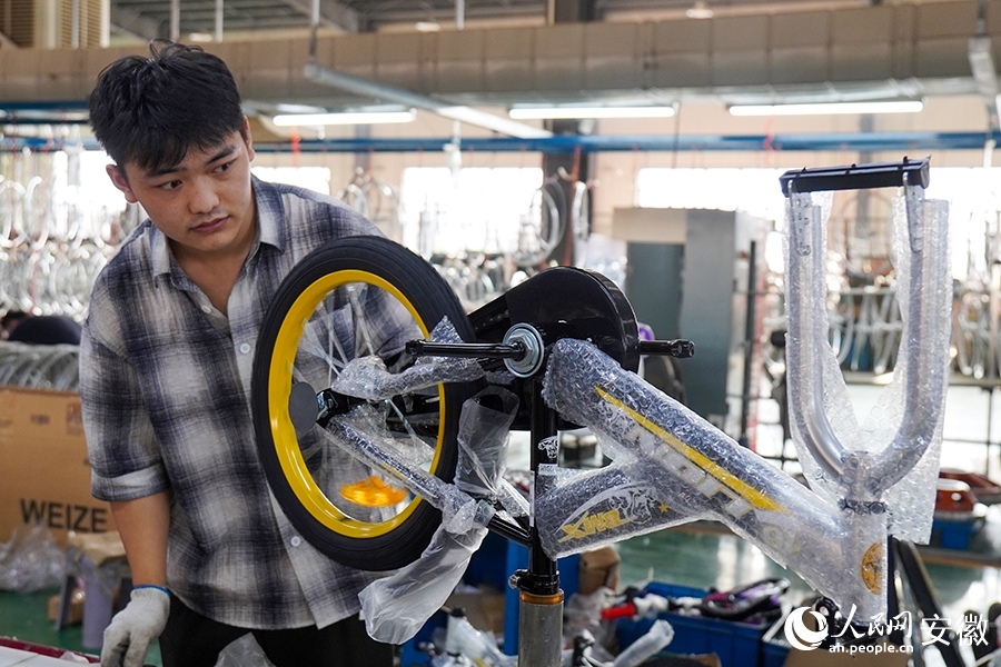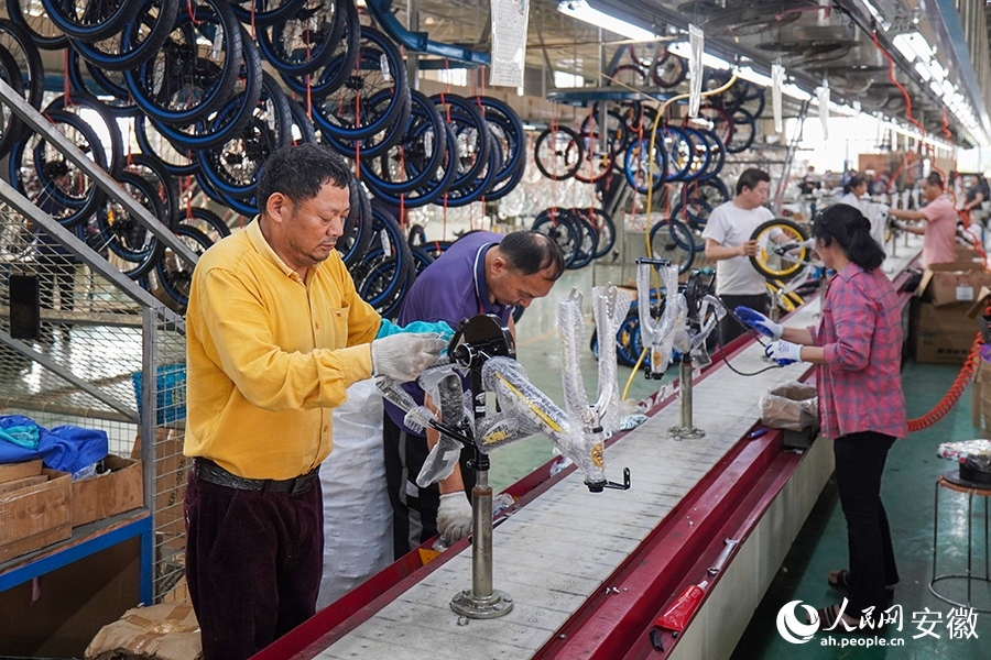 | Seorang pekerja memasang basikal di sebuah bengkel di taman industri basikal di kaunti Wuhe, bandar Bengbu, Provinsi Anhui di timur China. (People’s Daily Online/Chen Ruotian) |