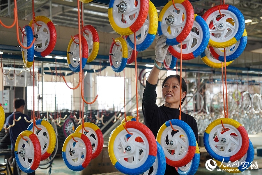 | Foto menunjukkan tayar basikal kanak-kanak di sebuah bengkel di taman industri basikal di kaunti Wuhe, bandar Bengbu, Provinsi Anhui di timur China. (People’s Daily Online/Chen Ruotian) |