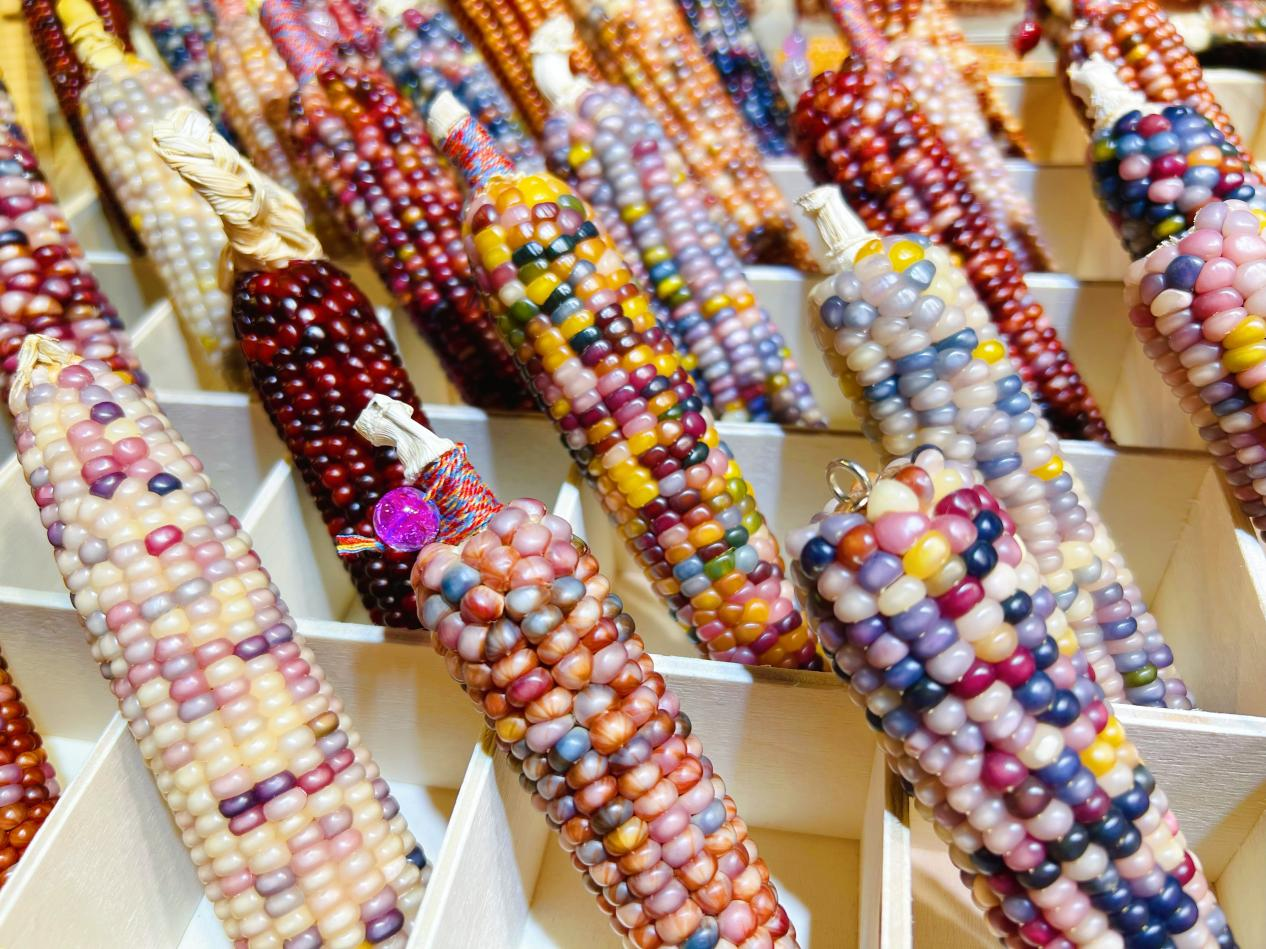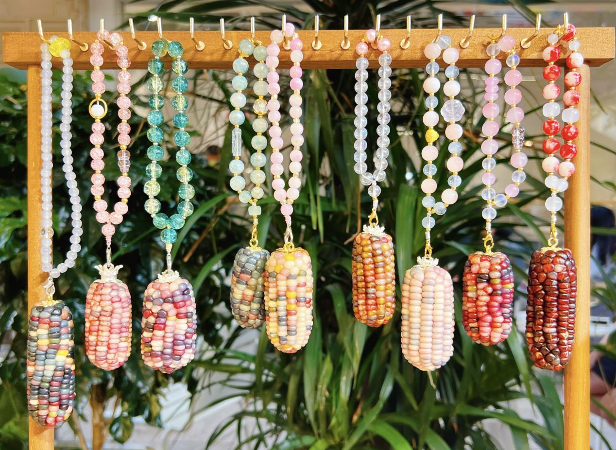 Selepas dikeringkan secara semula jadi, dipilih secara teliti, dan melalui proses kreatif, jagung yang berwarna-warni itu berubah dalam pelbagai bentuk termasuk rantai kunci, gelang, loket dan seni pada dinding.